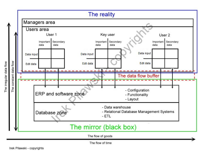 Ktoś zapyta. Dlaczego strefa Systemu Informatycznego została nazwana „Lustro” lub „Czarna Skrzynka”? Dlaczego lustro? Ponieważ system informatyczny jest jak lustro przekazuje nam obraz rzeczywistości. Jeżeli lustro jest brudne lub zniekształcone, przekazuje nam obraz niepełny lub zniekształcony. Tak samo robi to system informatyczny w stosunku do tego co dzieje się w firmie. Dlaczego czarna skrzynka? Ponieważ jest to strefa w dużym stopniu niezrozumiała i tak zwykle widzi ją większość użytkowników systemu pracujących w innych działach niż IT.