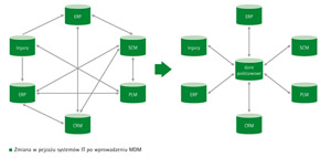 Dzięki MDM powstaje jeden punkt sieci systemów z predefiniowanymi modelami obiektów biznesowych, umożliwiający import danych z dowolnego źródła, ich centralne zarządzanie, publikowanie, kontrolę wersji.