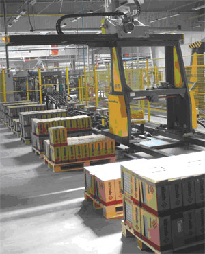 Sortownia pełni rolę ogniwa pośredniego pomiędzy wydziałem produkcyjnym płytek a magazynem wyrobów gotowych. Od lipca br. operatorów wózków widłowych wyręczają roboty, które przyjmują wyroby z produkcji i na podstawie danych z systemu SAP przygotowują odpowiednie partie towarów do przemieszczenia do magazynu wyrobów gotowych.