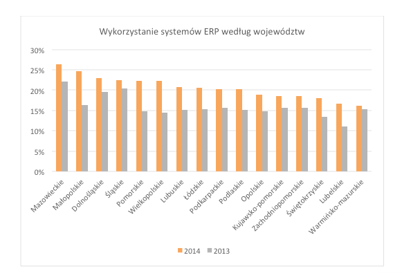 Przyglądając się wykorzystaniu systemów klasy ERP według administracyjnego podziału na województwa, niekwestionowanym „zwycięzcą” jest województwo mazowieckie, gdzie aż 26 procent wszystkich zarejestrowanych tam firm korzysta z oprogramowania ERP. O 1 procent mniej zdecydowało się na system ERP w woj. małopolskim. Trzecim województwem z największą ilością funkcjonujących systemów klasy ERP jest dolnośląskie. Co ciekawe, w 2013 roku na drugim miejscu znalazło się woj. śląskie, zaś pierwsza i trzecia lokata pozostały niezmienne. Kształtowanie się liczb przedstawia poniższy wykres.