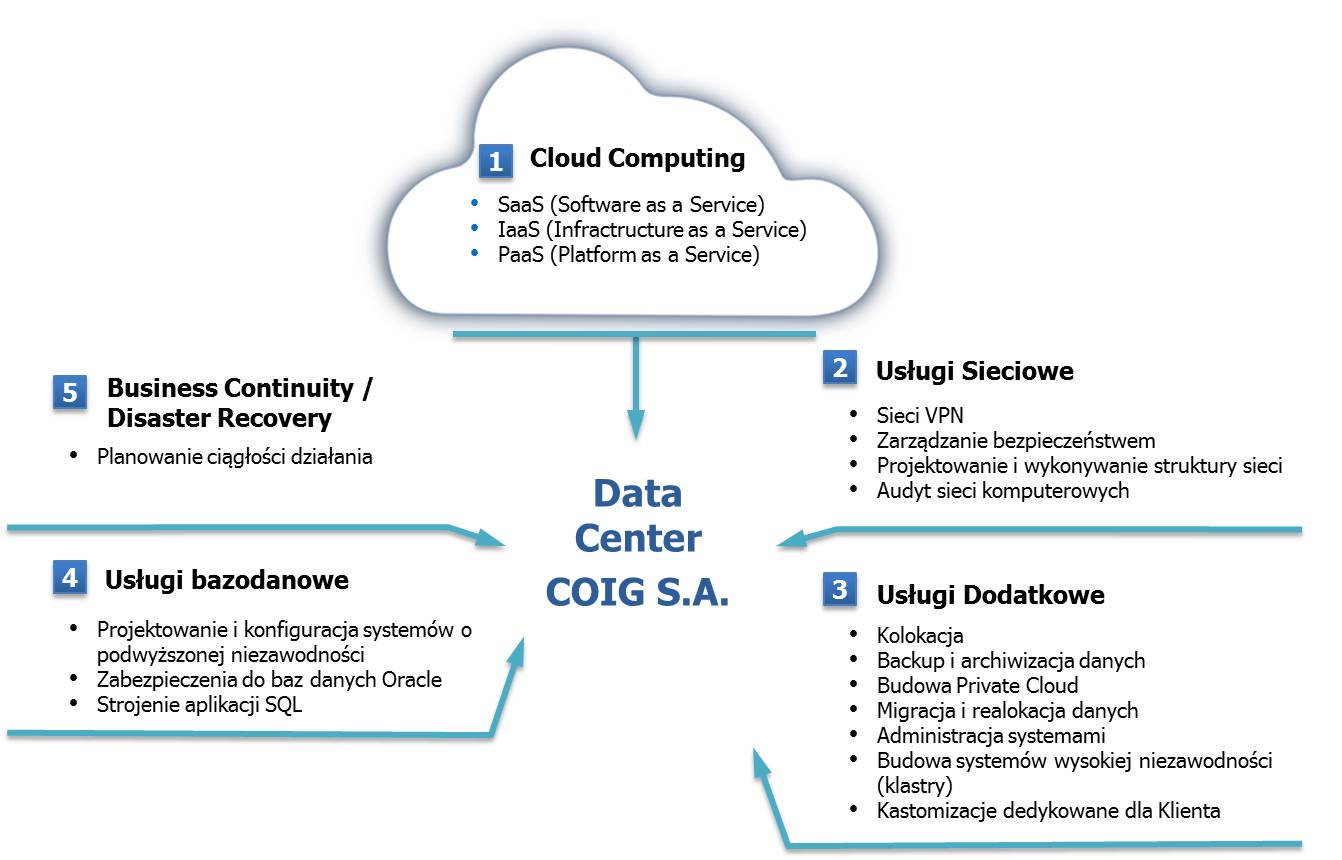 Data Center obsługuje ponad 20 000 użytkowników systemów ERP w modelu outsourcingu i Cloud Computing. Platforma sprzętowo-programowa doceniona została m.in. przez Kompanię Węglową, gdzie użytkownik korzysta z mocy obliczeniowych Data Center COIG S.A. w modelu Software as a Service (SaaS). Z kolei firma Sygnity S.A. udostępniła produkty z rodziny Quatra w postaci chmury obliczeniowej w modelu SaaS, korzystając z usług Data Center COIG S.A. Są to koronne przykłady wykorzystania możliwości jakie daje Cloud Computing, gdzie Klient koncentruje się na rozwiązaniu, a dobór i zakup sprzętu oraz licencji, zasoby ludzkie i ich kompetencje, nieustanny monitoring IT od strony sprzętowej, pozostawia w gestii firmy outsourcingowej. Z roku na rok dostawcy oprogramowania są coraz bardziej zainteresowani wdrażaniem oferowanych rozwiązań przy wykorzystaniu usług Cloud Computing. Możliwości tutaj jest bardzo wiele i jest to kierunek, jaki będą obierać przedsiębiorstwa szukając innowacji i oszczędności.